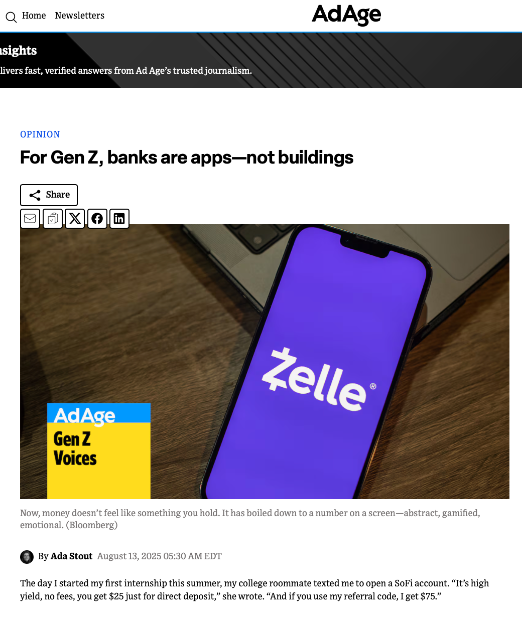 In August 2025, in AdAge Gen Z Voices published my op-ed that examined how Gen Z is redefining financial trust through mobile-first platforms and peer-driven recommendations. Supported by the PR and marketing team at Prophet Brand Strategy.