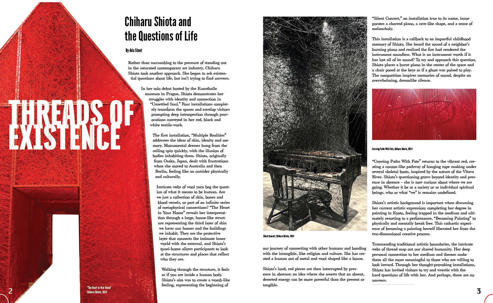 The layout integrates a two-column grid, intentional image placement, detailed attributions, and a map-based infographic I built from scratch. One key breakthrough was wrapping typography around Shiota’s dominant installation form to create natural visual flow. This project allowed me to merge my journalistic background with my design training, resulting in a cohesive, publication-ready spread that emphasizes clarity, storytelling, and thoughtful visual organization.