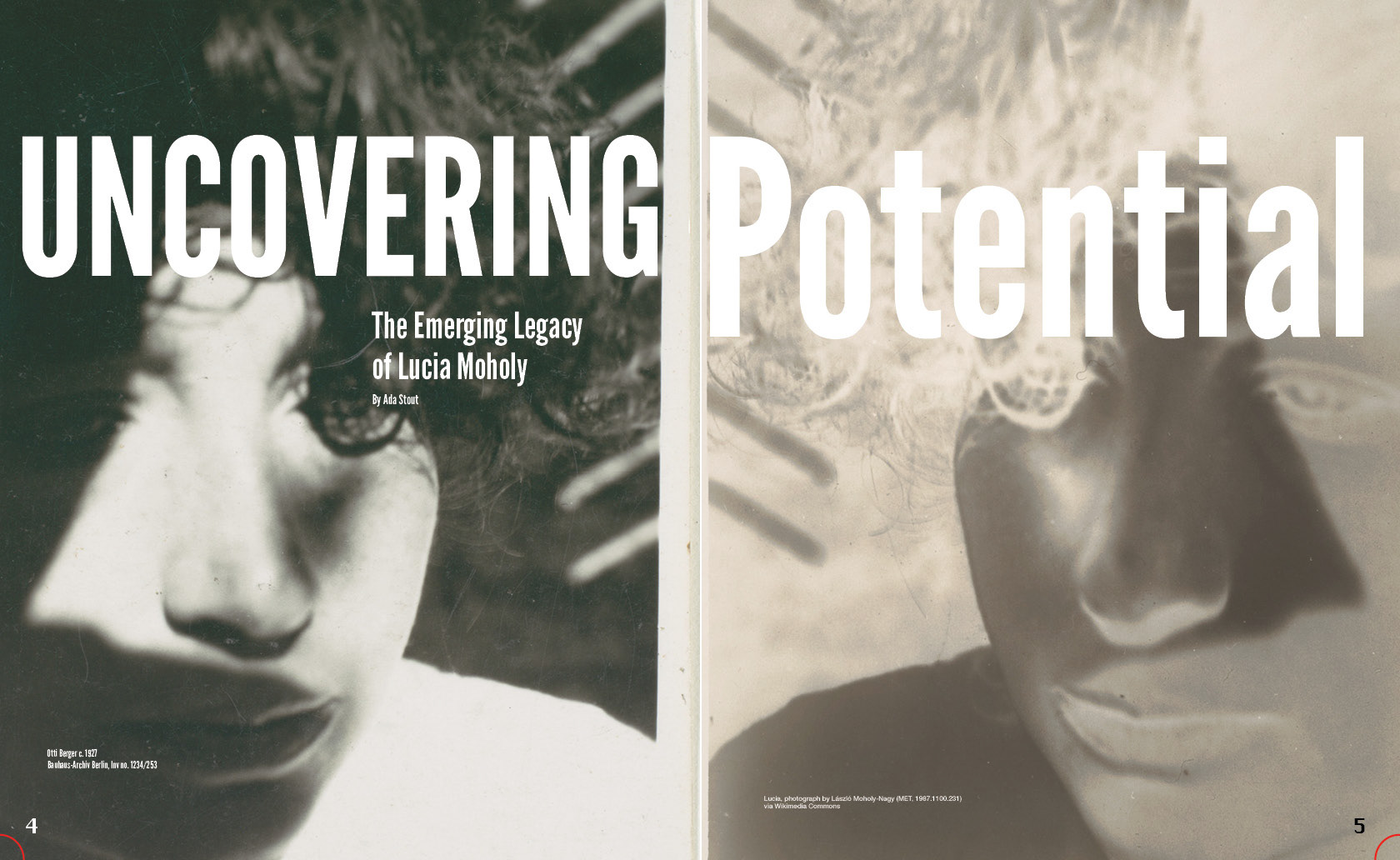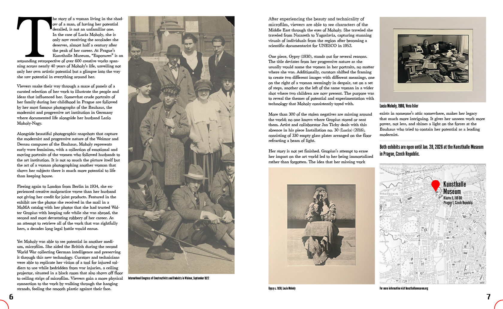 For this project, I designed a multi-page magazine feature reviewing two art exhibitions I visited in Prague. I combined my original writing with a visual system built around color, hierarchy, and movement, allowing the artwork to guide the structure of each spread. The vivid red of Chiharu Shiota’s installation became a focal point and informed both my accent palette and type placement, while the monochrome Bauhaus photography of Lucia Moholy introduced contrast and a shift in tone. I also created a custom “Opaline” wordmark to establish a distinct editorial identity.